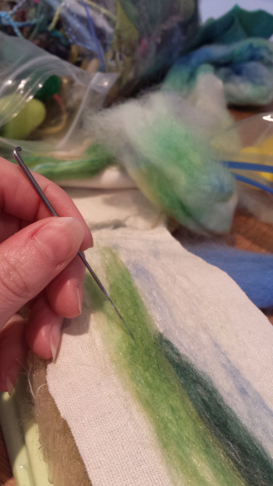 Today I'm playing around with some new ideas. With Mother's day and World Book Day both round the corner I felt like making some book marks. Here's a quick peek at the trial run I'm part way through felting. When completed it will probably have a sheep or two on it and a little hand embroidery in the foreground...